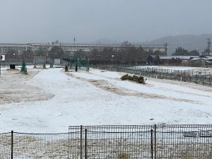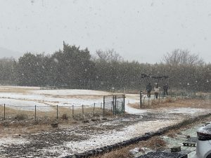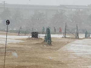 2/8(日) 寒波襲来でAM10:30頃から雪が降りだしました。15分ほどでコースは白くなりましたが、15名ほど元気にプレイしてます。素晴らしい。感謝一杯です。滑らないよう頑張って下さい。