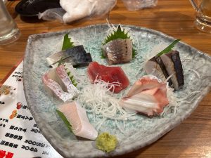 15:40 貞光PG出発。17:00 徳島駅近くの地元の居酒屋で夕食。刺身がおいしかったです。